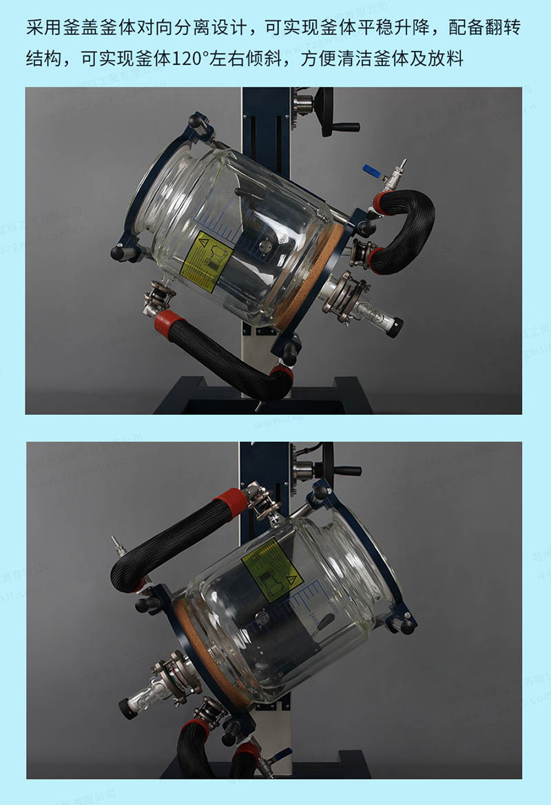 1、釜體可手動升降,便于投料和塊狀晶體取出,可以0~120°旋轉,便于清洗。